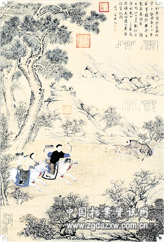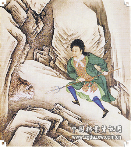 随着东西方交往日益频繁,许多西洋画师来到中国并进入宫廷,他们向西方人揭开了皇帝的神秘面纱。至雍正朝,雍正帝对洋装颇感兴趣,他常命宫廷画师在创作的画像中融入西方服饰元素。《胤禛行乐图册·刺虎页》绘制了雍正帝在悬崖山洞旁举叉刺虎的场景。该画作的奇特之处是雍正帝头戴西洋假发,身着洋装,俨然欧洲人的装束。《胤禛行乐图册·刺虎页》的人物画法明显具有肖像画的特点,面部五官生动逼真,与另一幅雍正帝半身肖像画十分相似。有学者研究,该画的表现方式应该是受当时欧洲流行的“扮装舞会画像”影响,画师用此种画法展现出了雍正帝的个人特质。