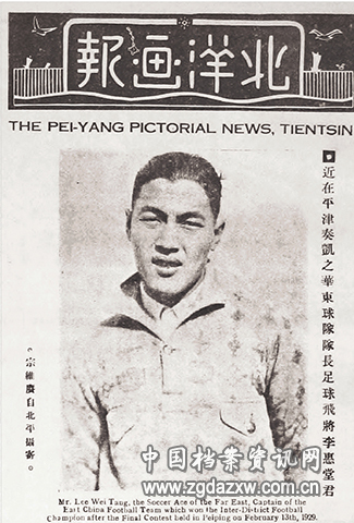 李惠堂出生于香港,从1923年第六届远东运动会开始成为中国足球队主力。他身高1.82米,速度超群,技术全面,控球、射门出神入化,当时已有“球王”“足球飞将”之称。1976年,德国足球杂志评选20世纪世界五位球王,李惠堂与贝利等共同入选。在中国国内,李惠堂也是一颗耀眼的明星,1929年2月,《北洋画报》就曾在封面刊登他的照片。